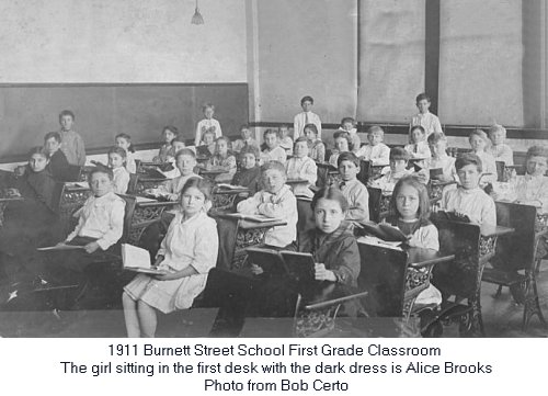 The Burnet Street School originally occupied the Public School House on State Street. From Reports of the City Officers for the year 1873: The site for this new building is 100 feet on Burnet Street, 92 feet deep, and then extends either way making a rear width of 242 feet, with a further depth of 108 feet, at a cost of $10,000. Subsequently a strip of land was purchased for $150, extending the school lot to Eagle Street. The building is properly two stories, though only the upper story is occupied for school purposes; the first story is entirely above ground and is used for the principals room, ward robes and play grounds. The builders were D. W. Crane & Co., masons, and William Demarest, carpenter. The entire cost of the building, furniture, heating, etc., was $52,500, nearly $3,000 have been expended for alterations and extraordinary repairs since its erection. The building will accommodate 800 pupils, and has been filled from the first opening. The building is heated by steam. The class rooms are all large but the ventilation is imperfect - we have to depend mainly upon the doors and windows. A Primary school was organized in 1855, in the Washington school house, corner of Orange and North Essex streets. The house was built by subscription and held by trustees. It was rented by the Board of Education. It was a stone building, two stories high, with one large room on each floor. About two hundred children used to congregate here, year after year, until the Burnett street house was built, when the school was transferred to that where it occupies seven rooms. |