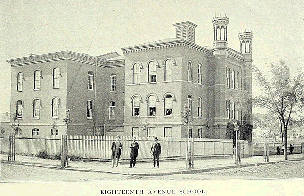 From: Essex County, NJ, Illustrated 1897 The first building was erected in 1871 and consisted of eight classrooms. In 1873 it became necessary to enlarge it, by the addition of a building in the form of a large T, which, surmounted by two turrets, added to the architectural beauty of the present structure. This made a school of nineteen classrooms, none too large to meet the demands of the rapidly increasing poplulat6ion of the old Thirteenth Ward. The pupils and patrons of its early days purchased a large bell, which is hung in a belfry and its tones call the children from far and near to each session of the school. This has been of the greatest advantage in reducing to almost a minimum the number of cases of tardiness.