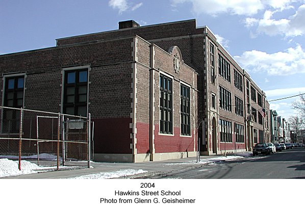 From: Essex County, NJ, Illustrated 1897 The Hawkins Street School was erected in 1887/88 and was first opened on January 3, 1889. It first opened with 5 class rooms occupied and continued with that number for a year and a half, being during that time an annex to South Market Street School In September 1891, another class room was opened and Mr. Clarence S. Griffin was appointed Principal of the school. The following September another class room was opened and the school has since continued with seven class rooms occupied. there is yet one unoccupied room. The ground floor of the building is occupied by the Principal's office and reception room, the boiler room and two large courts, on each for the boys and girls. The second and third floors are each occupied by four class rooms and reception rooms for the teachers The class rooms are large, well lighted and ventilated, and each capable of seating sixty pupils. Each room is provided with a cloak room and the cloak rooms, courts and the class rooms are all heated by steam. The building and side are valued at $36,000.