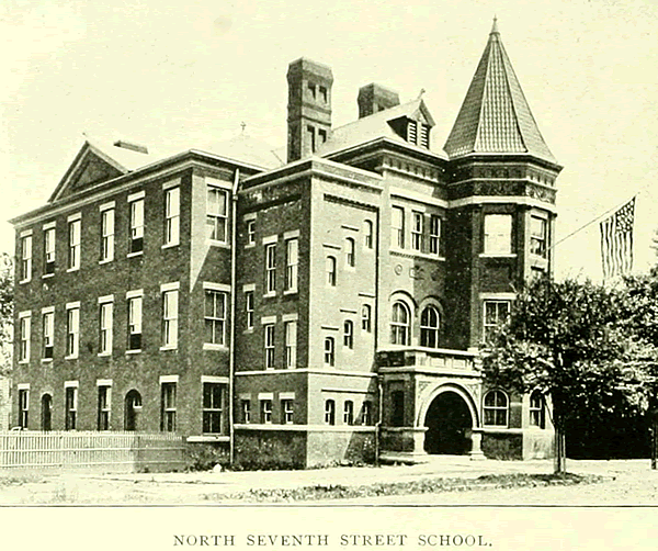 This school is located in that portion of our city known as Roseville. In 1854 an enumeration was taken and two hundred and fifty children of school age were listed here. Six years later the school was built on Roseville Avenue. In 1870 the school was moved to the site on North Seventh Street. It was known as the school in the woods. Before the days when the rules of the Board of Education became as inflexible as iron, many a pleasant afternoon did the children spend reciting their lessons under the trees to the music of the birds and many a nature lesson was learnt from dear Mother Earth herself. Soon after the Roseville or Eleventh Ward School was built, the rumble and roar of guns and cannon was heard through the land, and our section of the city was selected upon which to pitch "Camp Frelinghuysen" and from this camp fronting Roseville Avenue, extending north beyond Fifth Avenue, south to Sixth Avenue and east to the edge of what is now known as "The Park" marched our gallant soldier boys. It would greatly please the citizens of Roseville to have the memory of this event perpetuated by naming the new North Seventh Street School "The Frelinghuysen School". A new school building was opened in September, 1894.