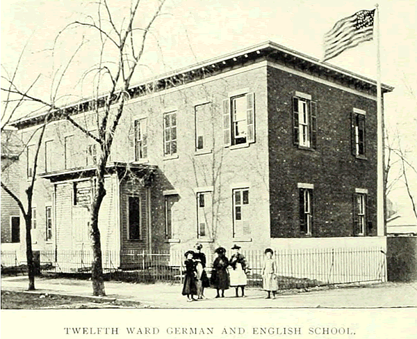From: Essex County, NJ, Illustrated 1897 The Twelfth Ward German & English School was founded December, 1858. The building is a two story brick structure, 70 x 30 feet situated on a plot of ground 100 x 90 feet and is valued at $12,000. It contains three classrooms and a kindergarten and prepares the children for entrance to the High School. The present number of pupils is two hundred and the chares are 80 cents per month for each child in the kindergarten and one dollar per child for those in the higher classes. Where three children of one family attend school at the same time, the third is admitted free. The Men's Society connected with the school, is coposed of 370 members who are all well known and enterprising citizens. The equarterly dues are seventy-five cents. The Ladie's Association has a membership of 130. Their dues are 15 cents per month. The school is in flourishing condition and free of debt.