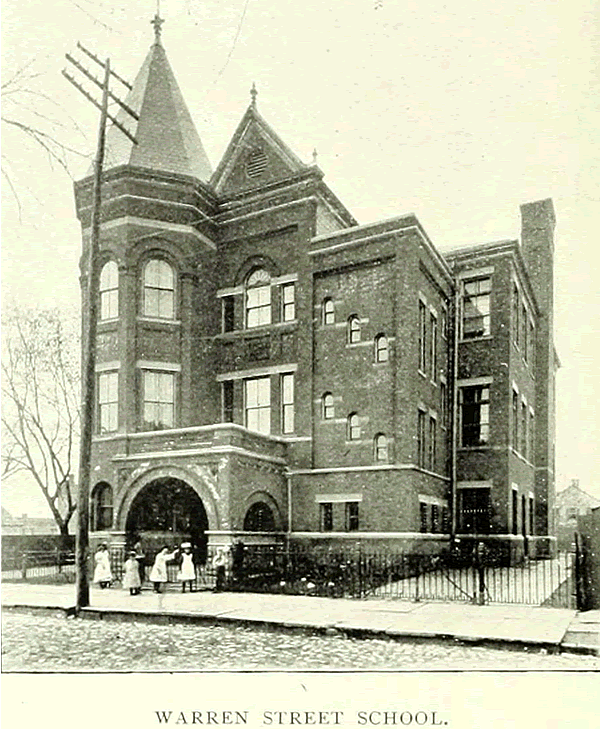 From: Essex County, NJ, Illustrated 1897 Nearly fifty years ago, James Searing, a generous-hearted man owning a large tract of land in the western part of the city, donated a plot at the corner of Wickliffe and School Streets to the city for school purposes. Here, in 1848, was built a plain two-story brick school-house, the third public school of Newark. At that time the male and female departments were under separate managements, the former on the top floor and the latter on the lower, each having an assembly room and two small recitation rooms. The school was afterward divided into six class-rooms. In 1872 this school, not being adequate to the demands of the locality, the Central Avenue School was built and the school transferred to it and the old building closed. In 1873 it was again opened, this time as a primary school with a lady principal. In 1891 it was again found too small and a new school was built on Warren STreet, west of Wickliffe. The Warren STreet school is of red brick with terra cotta and blue-stone trimmings. It is a three story building having two large courts and the Principals' office on the first floor while on each of the other floors are four large classrooms, with a wide corridor extending the length of the building, also a library and sitting room for the teachers. The building is heated and ventilated by the Fuller & Warren system. It is supplied with steel ceilings which, while very pretty, are not very satisfactory for school purposes. |